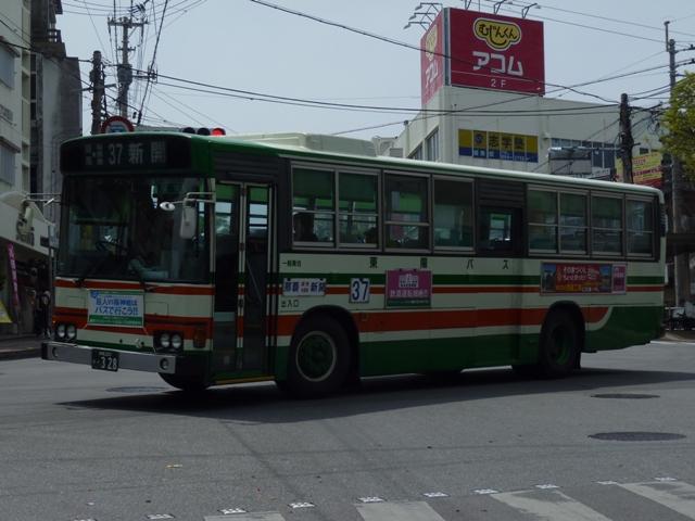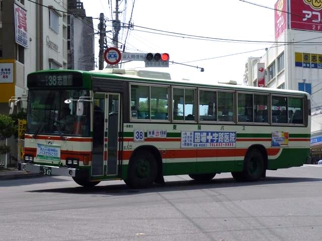 特定車を乗合改造したトップドア車。東陽バスで未だ少数派の角目ライトが特徴。