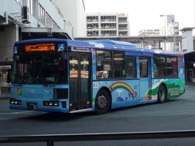 九州産交のノンステップバス塗装は水色をベースにしたカラフルでファンシーな独自