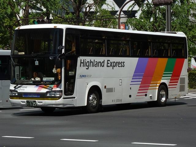 大型観光バスはセレガRにリニューアル。「開閉式ヘッドランプベゼルを備えた新しいフロントマスク 」が外観上もっとも目立つ変更点といえそうです。画像は当時のアルピコハイランドバス在籍のセレガRでフロント上下2枚ガラスのスーパーハイデッカーGD。