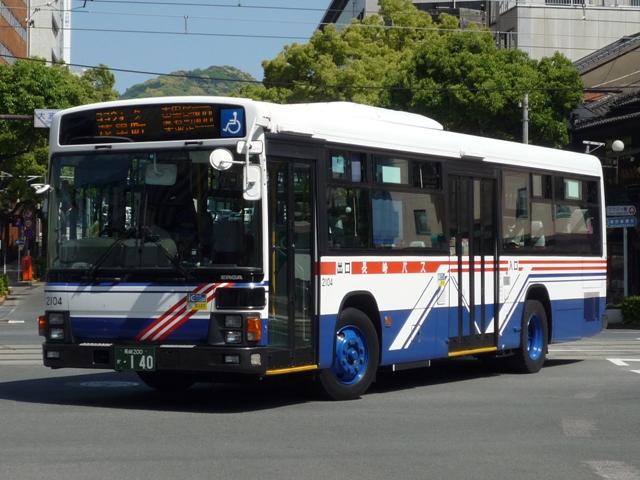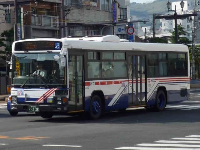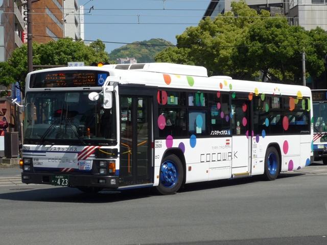 長崎自動車では少数派の中型車。路線限定で活躍しています。ワンステップの中型車は