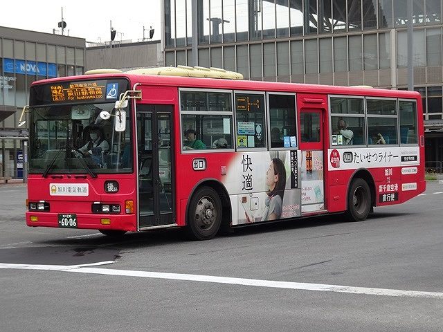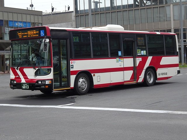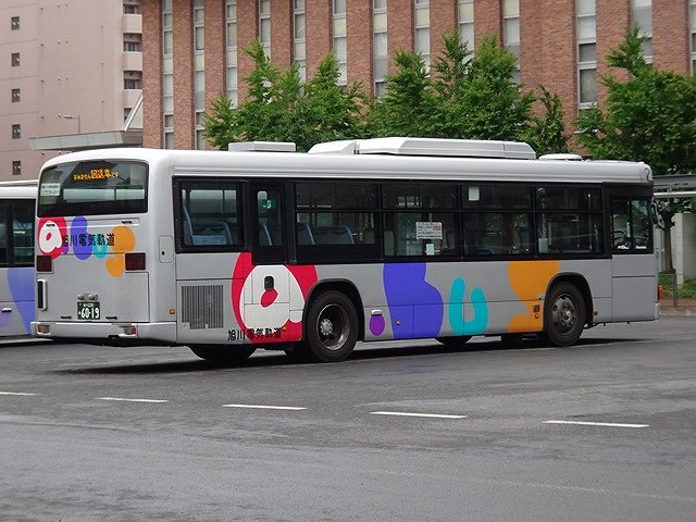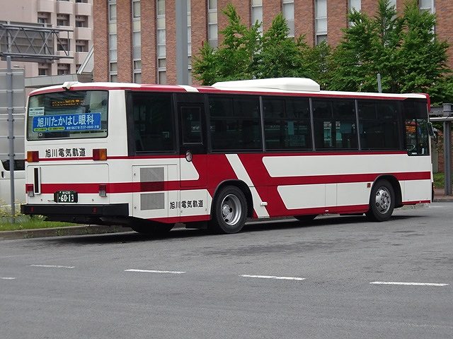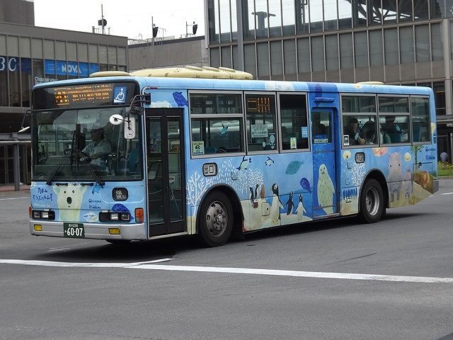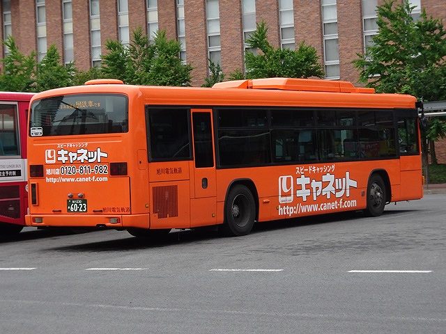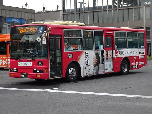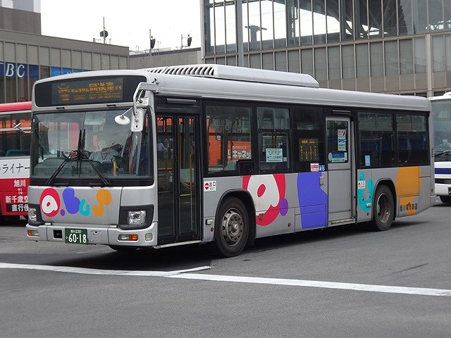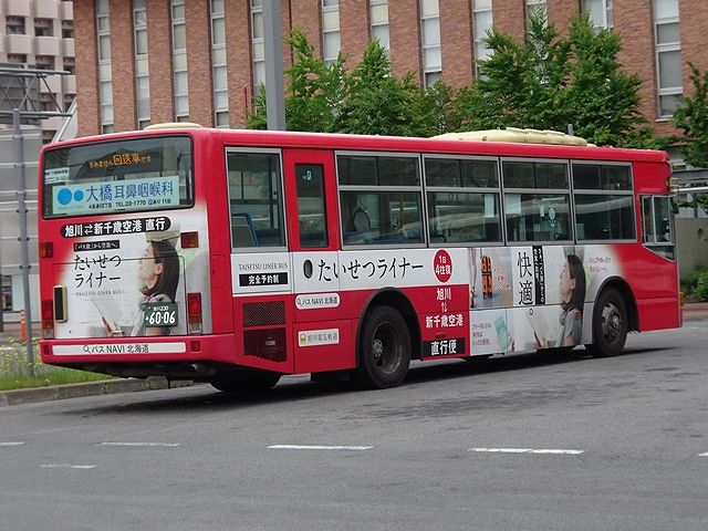 神奈川中央交通からの移籍車のほとんどは三菱ふそうMPワンステップ車でしたが、1台だけV8エンジンを搭載したKL規制車のいすゞLVワンステップ車も登場。ボディは旭川電気軌道が運行する都市間高速バス「たいせつライナー」の全面ラッピングとなっています。