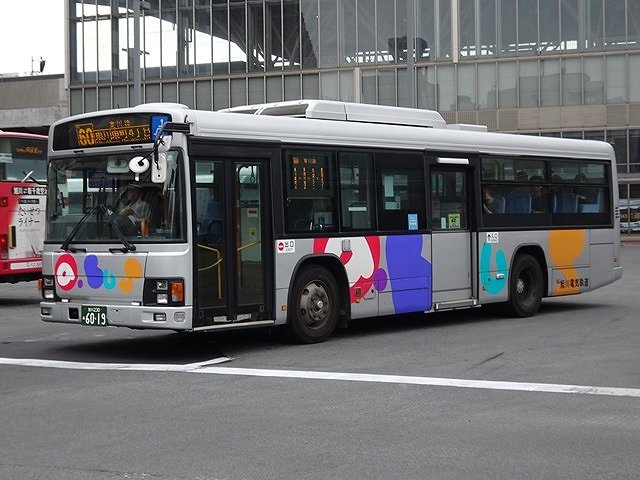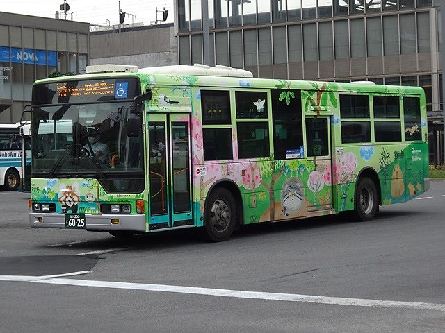 こちらのPKG規制車のいすゞLVワンステップ車は、旭川電気軌道をバス会社潜入レポートで取り上げた『バスマガジン125号』によると愛子観光バスからの移籍車とのこと。扉側だけラッピング広告車となっていました。