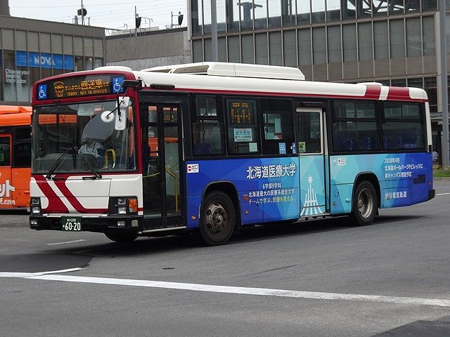 神奈川中央交通から移籍した三菱ふそうMPワンステップ車。移籍車導入再開時に登場した車両は旭川電気軌道の塗装に塗り替えず、ラッピングで対応したのは長く使う予定が無かったからなのか、早く運用に入らせたかったからなのか。どうなんでしょうか。