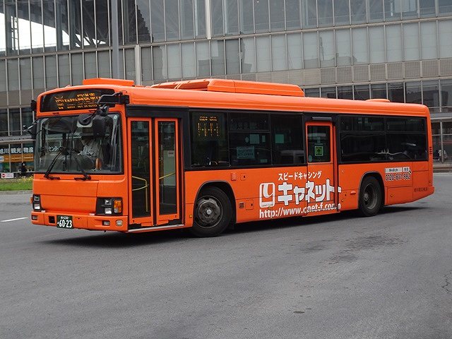 名古屋市交通局から移籍した日野KVノンステップ車。屋根まで含めた全面ラッピング広告車となっています。