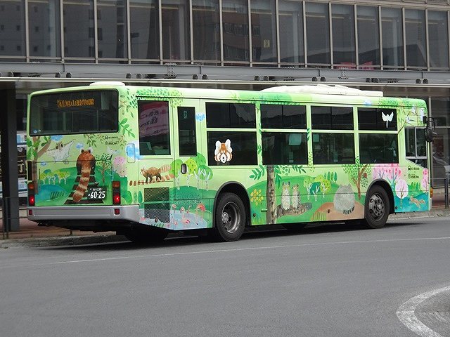 名古屋市交通局からは、MFBM製ボディにUD製MD92エンジンを搭載したMPノンステップ車も複数台移籍しています。三菱ふそうの公式リリース前に約100台製造した先行販売グループの車両なので、型式がワンステップ車の改造型式となっているのが特徴です。画像の車両は窓枠部までラッピングした「旭山どうぶつえん号」となっています。