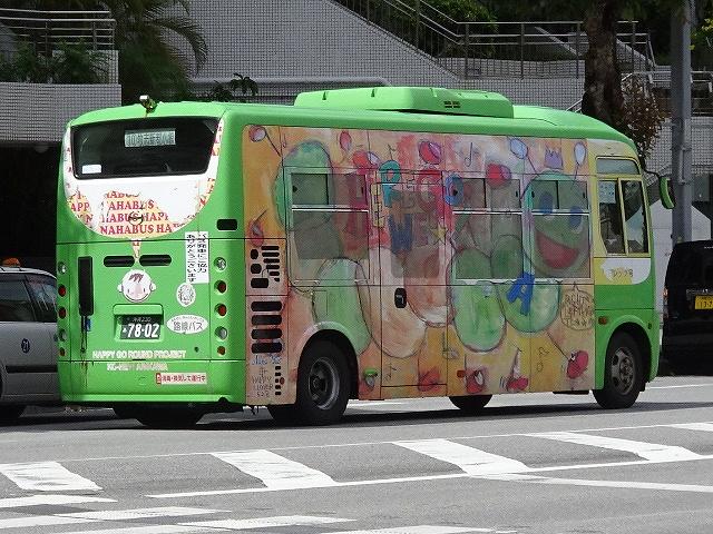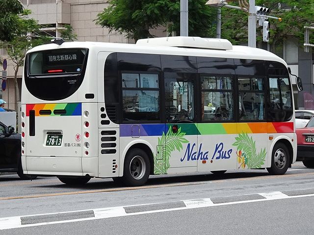 電気バスの続番号となったのはディーゼル車の日野ポンチョ。電気バスの導入はとりあえず打ち止めにした模様。レインボー帯にハイビスカス?のイラストの入った塗装は、7mサイズの那覇バス市内線車両向けのオリジナルデザインとなるようです。