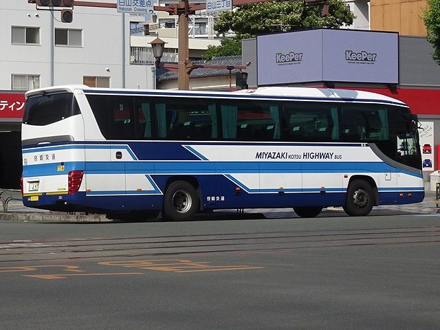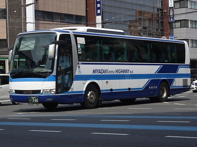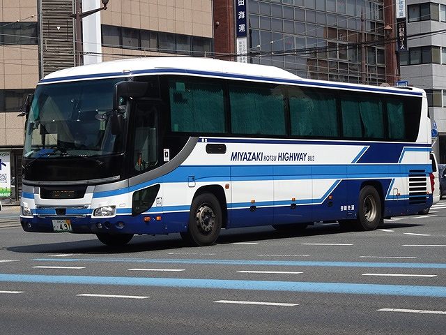2013年に導入したエアロエースな三菱ふそうMS。側面固定窓仕様で4列シート・トイレ付車両です。もともとは宮崎と延岡を結ぶ県内高速バス「ひむか号」開業にむけて導入した車両のうちの1台です。「ひむか号」は2014年に東九州自動車道の延岡~宮崎間開通にあわせ運行を開始しましたが利用状況は低迷、2020年のコロナ禍で運行休止となりました。「ひむか号」の運用車両は年式も新しいこともあり、現在は4列シート車運用路線で活躍しています。