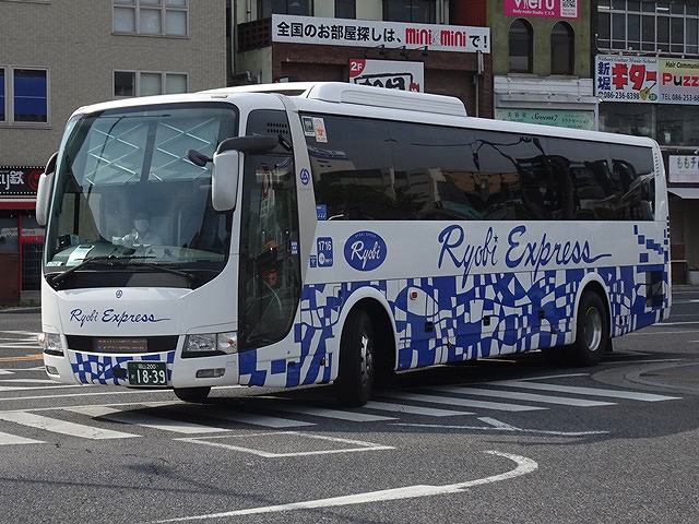 まずは、岡山ではなく愛媛県松山市内で記録した画像から並べます。2013年に導入したエアロエースな三菱ふそうMSハイデッカー。画像の車両はこの日松山と岡山を結ぶ「マドンナエクスプレス号」の運用に入っていました。