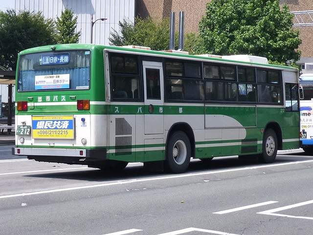 熊本都市バスに在籍する日野HUツーステップ移籍車を右斜め後ろから。