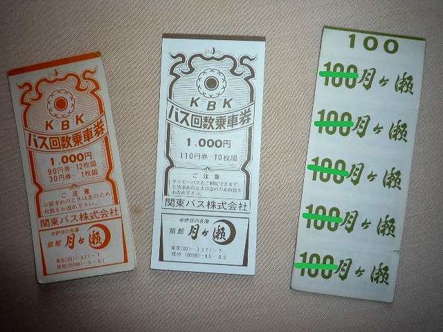 せっかくなので、今は販売を終了した回数券の画像も並べておきます。1000円の回数券は確か販売窓口が限られていたと記憶。広告の「月ケ瀬」は伊豆にあった旅館で関東バスが経営していましたが、回数券販売終了とほぼ同時期に廃業となりました。