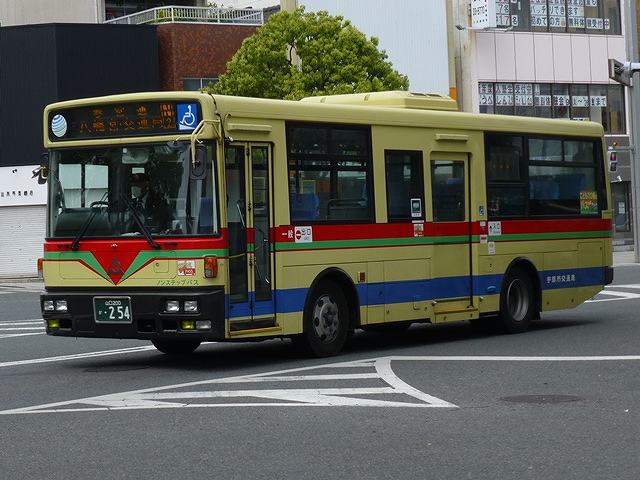 まずは西工ボディの日野中型ワンステップ車。ワンステップ車を比較的早い段階で導入しているのが、公営バスらしいところ。低床車は塗装に緑色の帯を追加していますが、このタイプの車両の緑色帯は細すぎな感。 上下で車両が異なり失礼します。