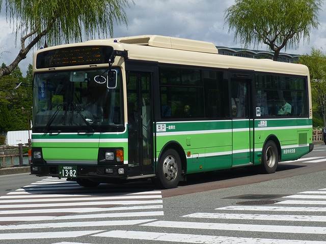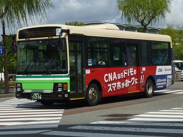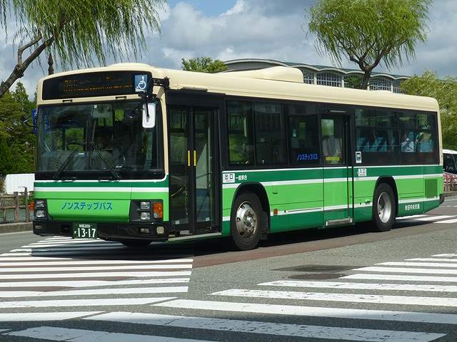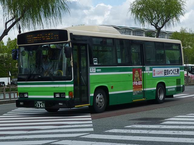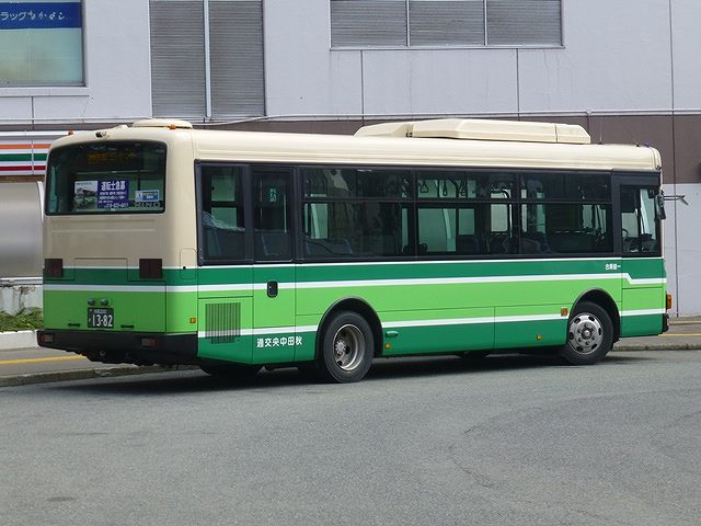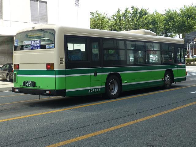 ちょっと立派なバックミラーを装備している日野RJワンステップ車は朝日自動車グループからの移籍車。朝日自動車が初期に導入したワンステップ車は車椅子対応のスロープを装備していないため、正面行先表示横に車椅子マークがありません。