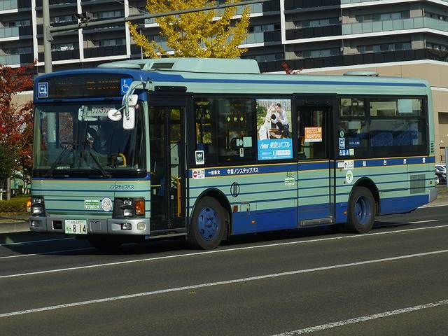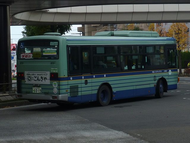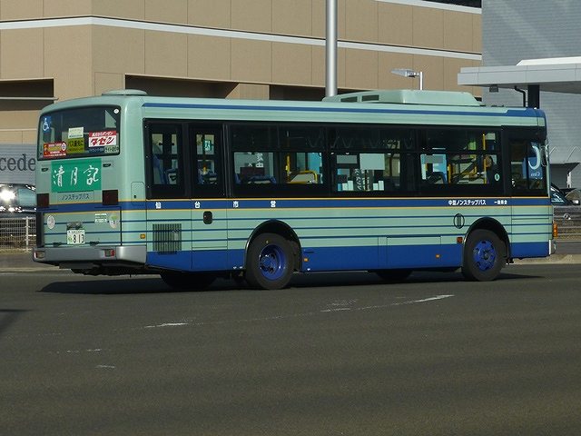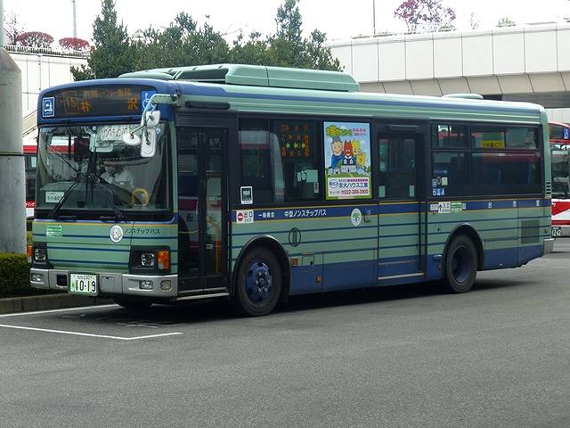 中型車は狭隘路線やローカル路線を中心に担当しており、仙台駅発着路線でも見ることが出来ます。まずは日野RJワンステップ車。仙台市営バスは90年代からコーナリングライトを装備しており、画像の車両のようにバンパーに埋め込まれているのが特徴。