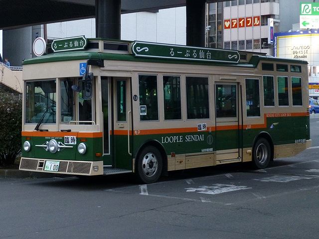 最後に、仙台駅を起点に仙台市中心部の観光スポットを結ぶ循環バス「るーぷる仙台」専用車から1台。「るーぷる仙台」は路面電車をイメージしたボディの特装車で運行しており、画像の車両はいすゞLRノンステップ車をベースに仙台市電をイメージした塗装となっています。特装車でもコーナリングライトをしっかり装備しているのはさすがです。