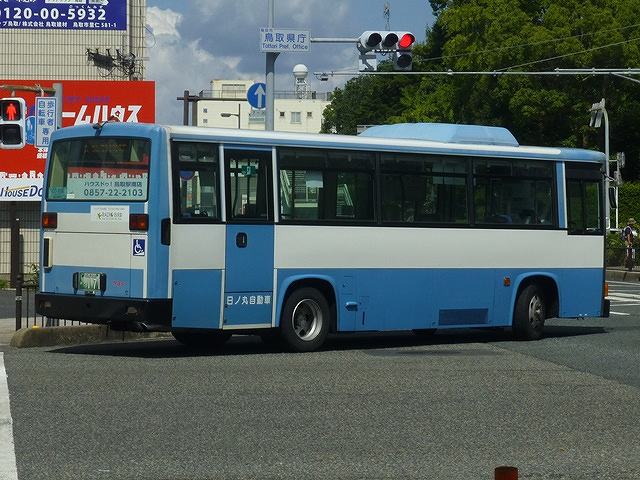 一般乗合車は現在中型がメインとなっている日ノ丸自動車。大型車も在籍していますが、今回記録できたのは中型車のみでした。まずは、古参格となる中扉折戸仕様の日野RJ。ワンステップバスベースにステップを加えたツーステップ車となっており、側面に貼られた犬(ダックスフンド?)シルエットには「低床バス」と書かれています。行先表示は前面と側面のみという、往年の日ノ丸自動車仕様で、残り少なくなった幕式の行先表示を装備している車両です。古参車ということで、画像のように教習車で使われていることが多い模様。ちなみに一般乗合車の塗装デザインは日野ブルーリボンのカタログカラーをアレンジしたもの。かつては全国各地でほとんど同じ塗装or色違いな白ナンバーの送迎車を見ることが出来たものでした。