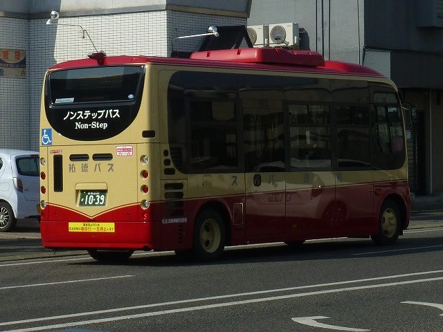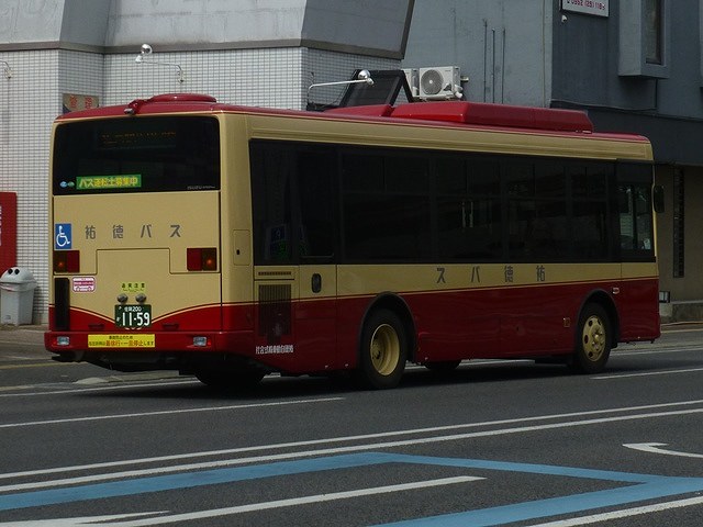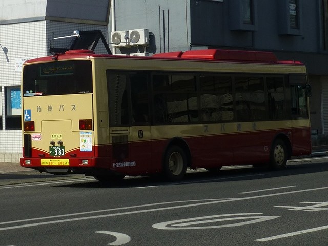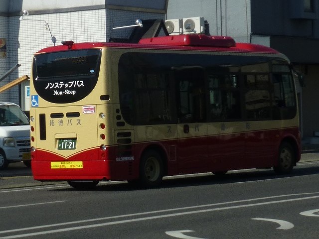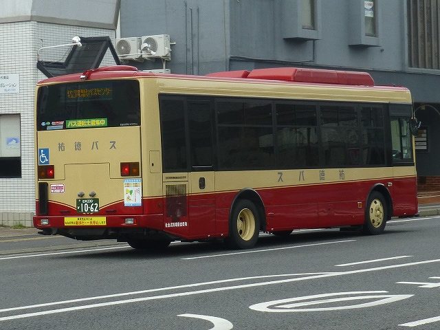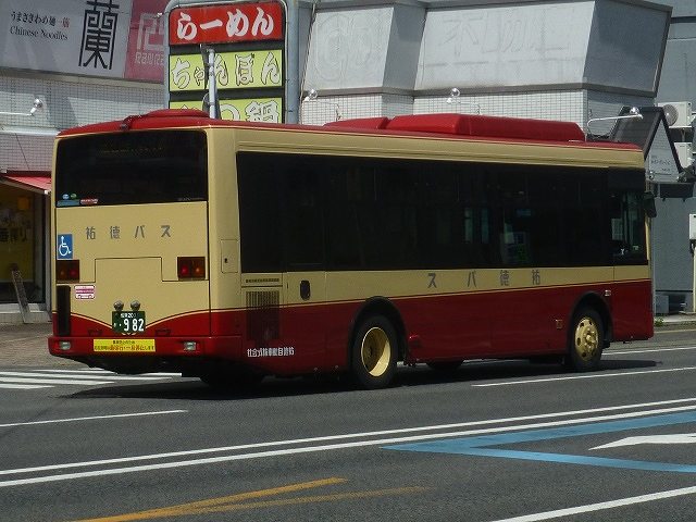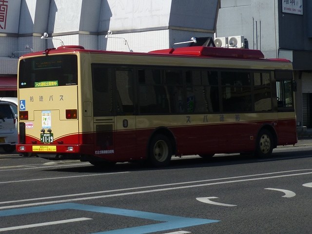 塗装は祐徳バス時代のカラフルな暖色帯デザインのままとなっています。現行塗装への塗り替えが進み、この塗装デザインで残る車両のほうが少なく感じられますが、実際のところはどうなんでしょうか。後面の行先表示は「ノンステップバス」幕で固定しているものとばかり思っていましたが、ご覧のように「祐徳バス」表示もあることが分かりました。