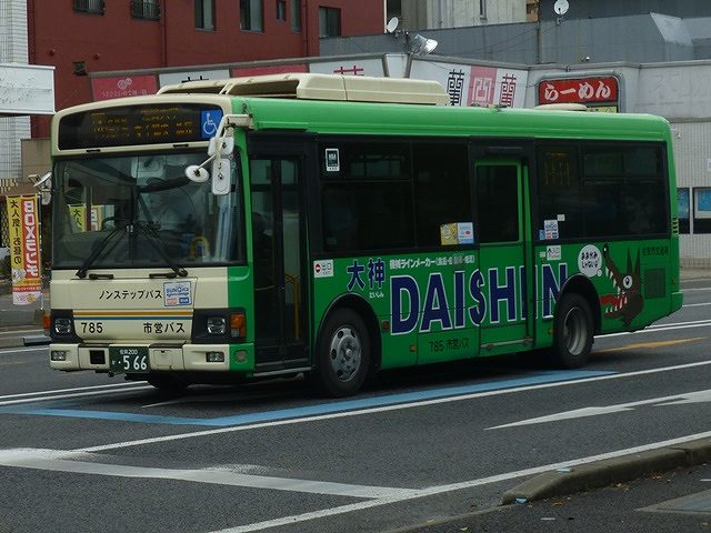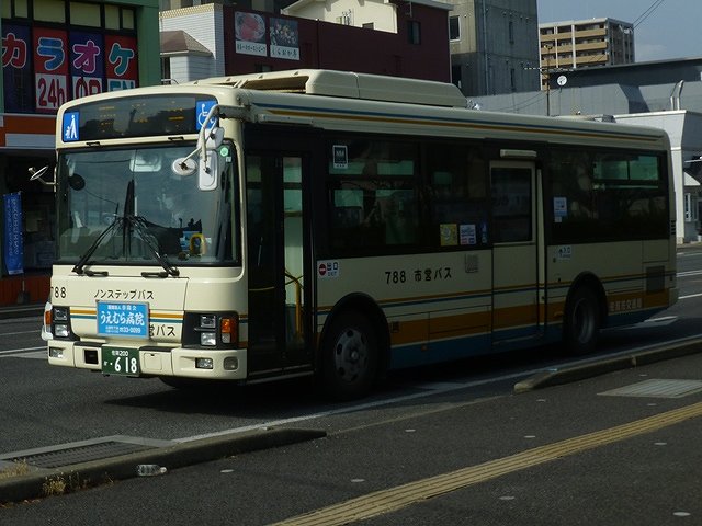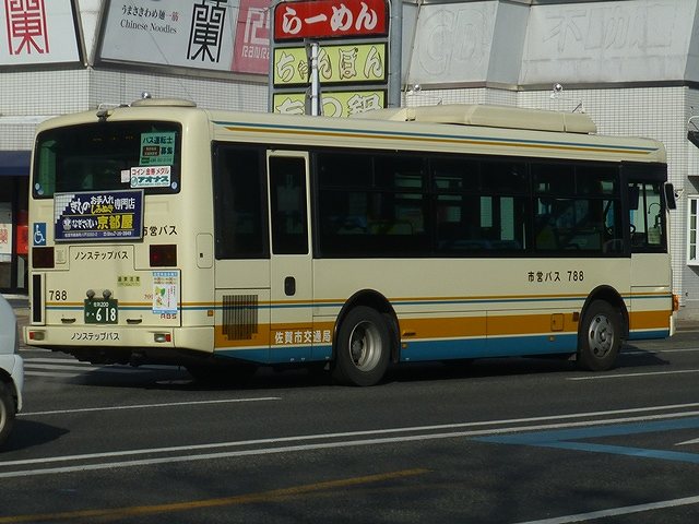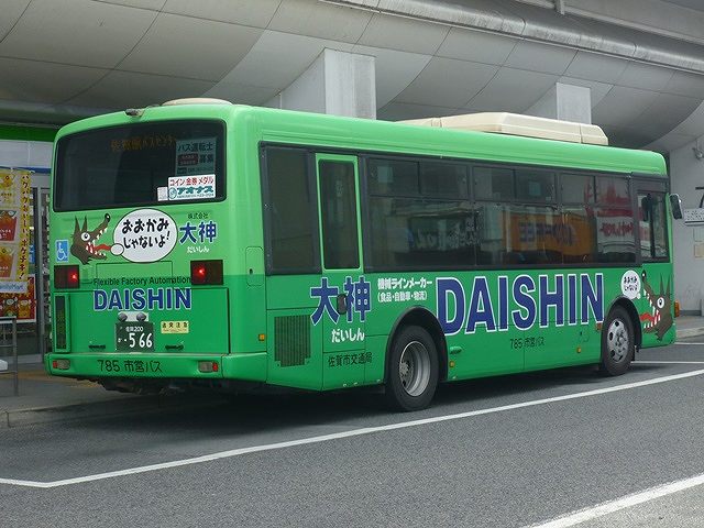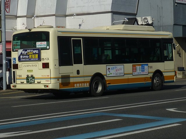 佐賀市営バス標準塗装車となっている車号786は正面・側面・後面に広告掲示枠を装備。