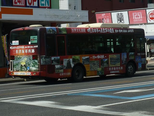 こちらは「明治日本の産業革命遺産」として世界文化遺産に登録された「三重津海軍所跡」をPRしたラッピング車となっています。「三重津海軍所跡」をPRしたラッピング車は2台在籍していますが、こちらは現地の写真を多数配したデザインとなっています。