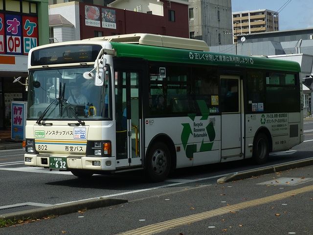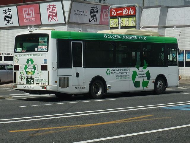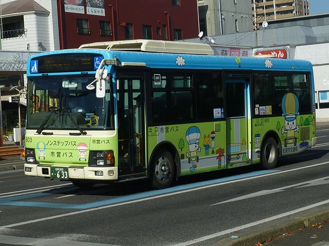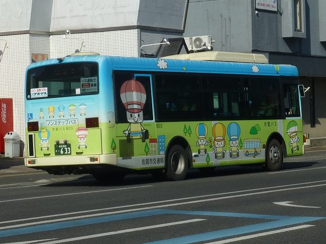 車号803は佐賀市交通局のマスコットキャラクター「のりまるくん」をメインにしたデザインで、前面も含めた全面ラッピング車となっているのが特徴です。佐賀市営バス創業75周年記念の一環として2011年に登場しました。