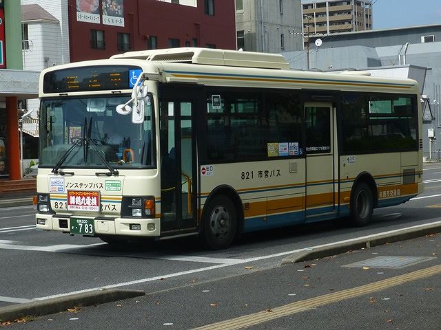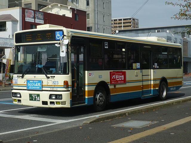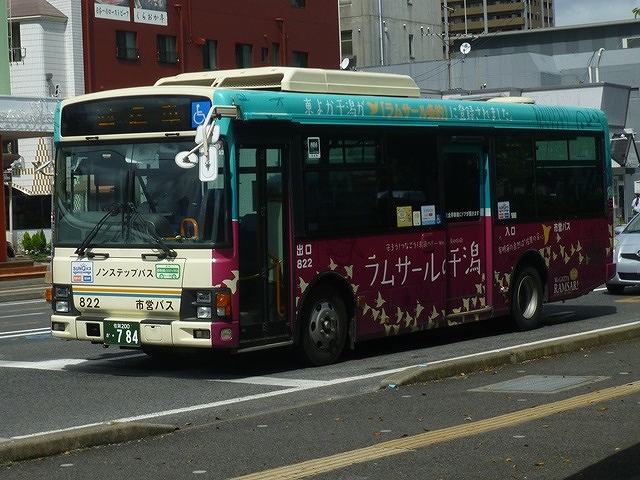 前年導入した車号823同様正面に広告看板を取り付けていますが、「ノンステップバス」の表記が隠れないようあらかじめフロントガラス下の狭いところに表記位置を変更しています。