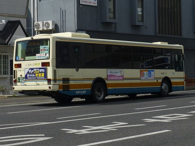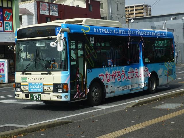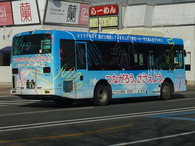 15年も、いすゞLRノンステップ車を3台導入。画像の車号825は佐賀市の保健福祉部が管轄する「こころの健康」HPをお知らせするラッピング車となっています。