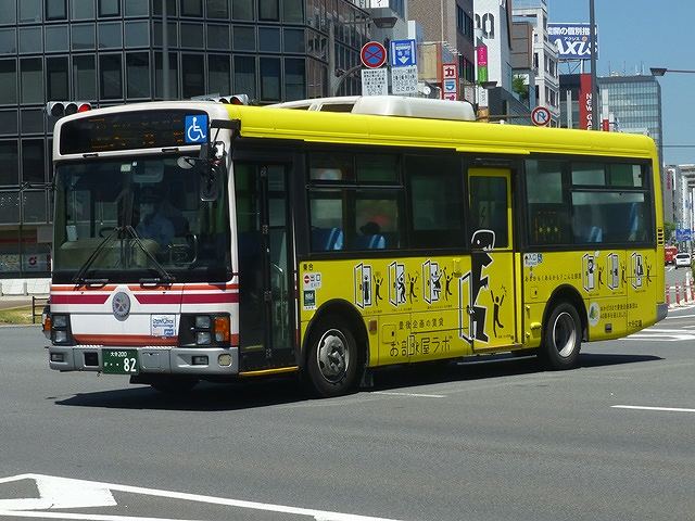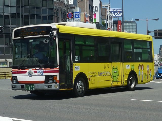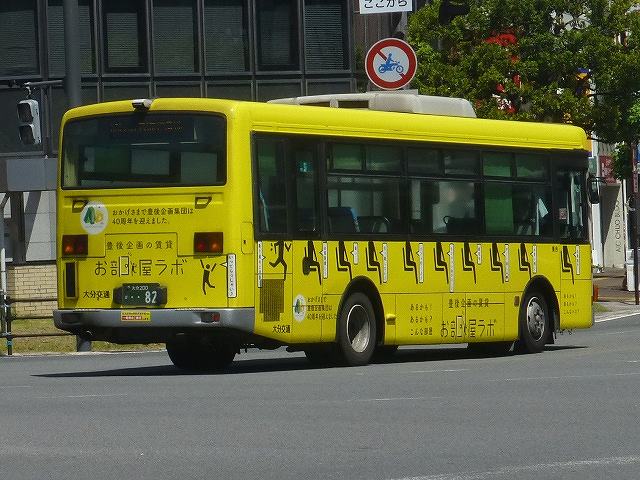 豊後企画集団による「お部屋ラボ」ラッピング車となっている01年導入のいすゞLR。交通バリアフリー法の施行により車椅子対応のスロープを装備したこともあり、01年導入車から中扉引戸仕様を本格採用し、あわせて側面の行先表示位置が中扉の後部に変わりました。ちなみに01年車はリーフサス仕様で導入しています。