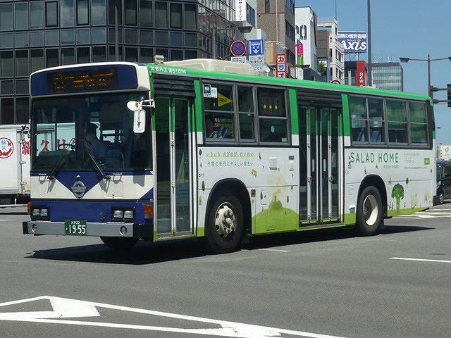 94年に導入した純正ボディの日野HTはこの1台だけ。坂井建設の「サラダホーム」のラッピングバスとなっています。