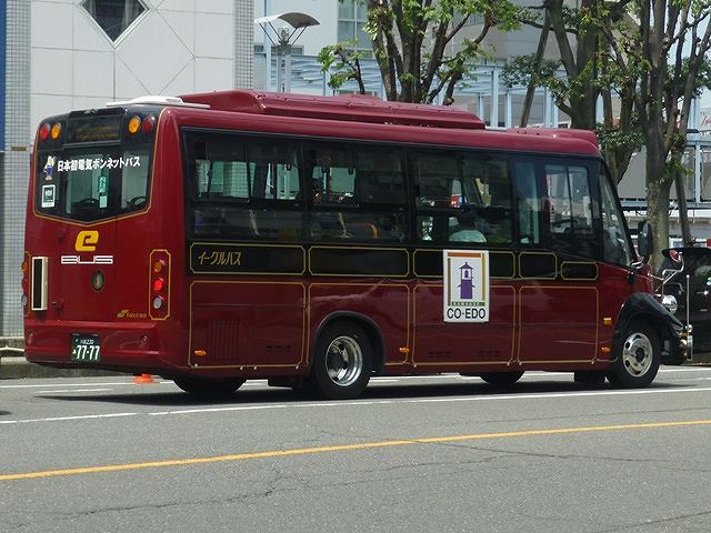 規制緩和を受けて一般路線バスの運行を開始した 」イーグルバスに在籍するボンネット風電気バス。「