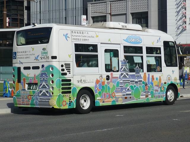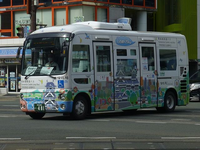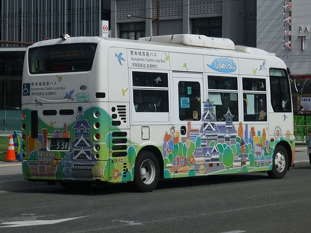 熊本城および周辺の観光スポットをめぐる熊本城周遊バス「しろめぐりん」。熊本駅を起点に桜町バスターミナルおよび桜の馬場・城彩苑を2度経由する8の字のルートで、平日はほぼ30分間隔、土曜・日曜・祝日は午前20分間隔・午後30分間隔で運行(2021年11月現在)しています。熊本市が専用車両を保有し、運行を熊本都市バスに委託する形態となっています。