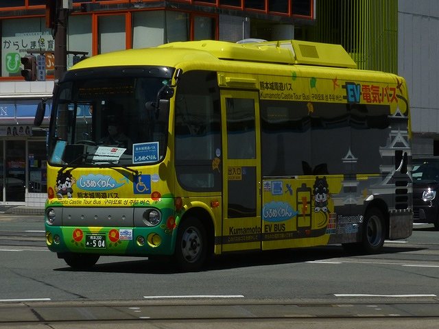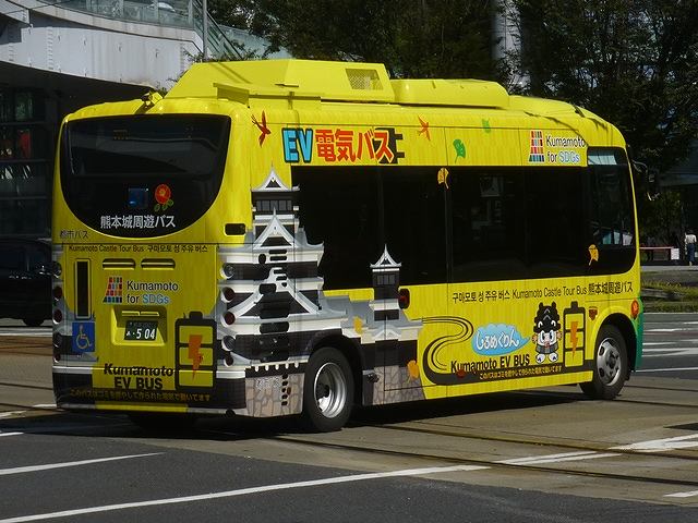 2020年11月から「しろめぐりん」専用車両に加わったEV電気バスのポンチョ。ロングサイズで1扉仕様の車両を産学官連携「熊本発EVバス」の技術を用いて電気バスに改造し、熊本市政策局が発表した報道資料によれば導入費用は6000万円(補助金含まず)とのこと。定員は乗員含め25人のため、バスでいうところの小判ナンバーを取り付けています。