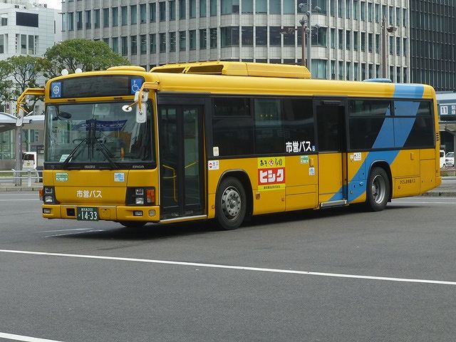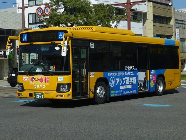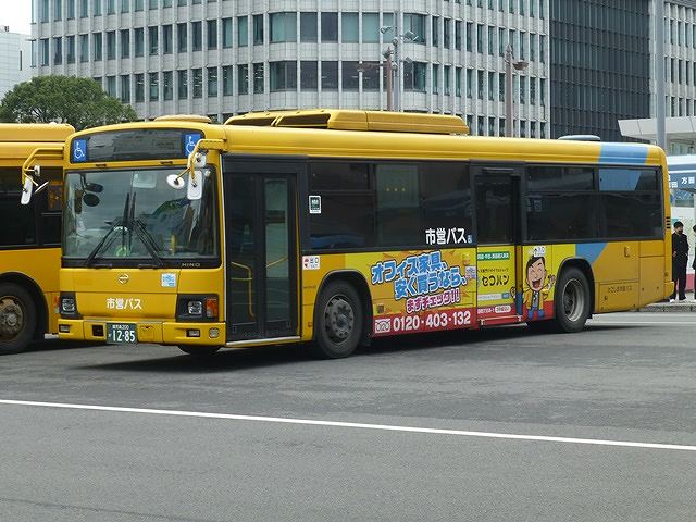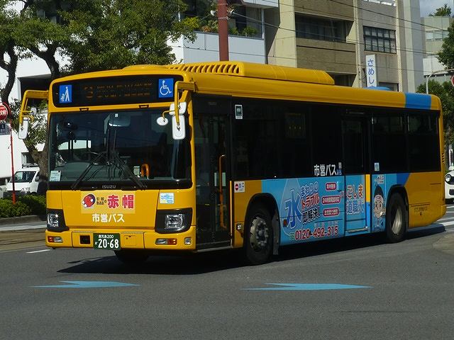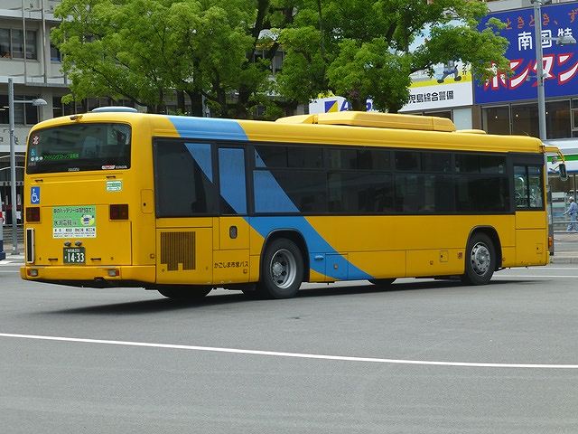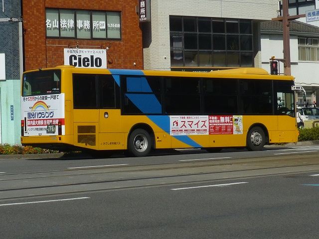 2011年は中型ノンステップ車と大型ノンステップ車を導入しました。大型ノンステップ車は日野のブルーリボンシティハイブリッド3台と、画像の三菱ふそうMPを1台導入しました。中扉の前後で側面窓下辺位置が異なる現行仕様のMPが鹿児島市営バスに初登場しました。現在はナンワエナジーの全面ラッピング広告車となっており、正面はナンワエナジーのマスコットキャラクター「えらブー」を大胆にデザイン。
