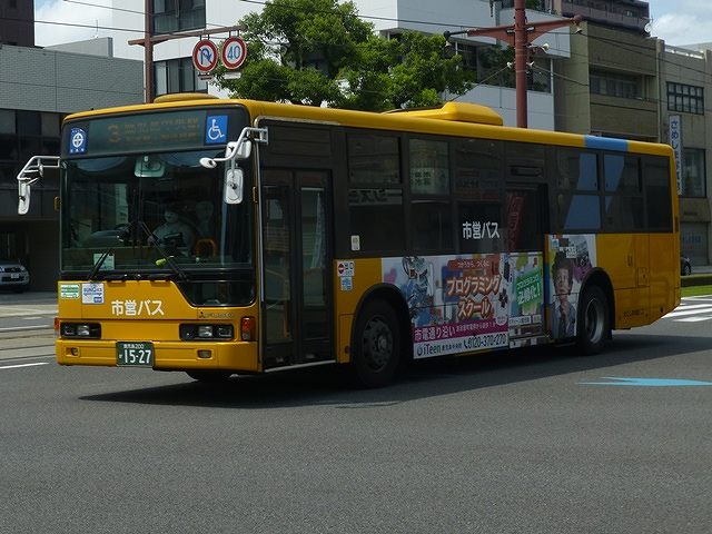 15年はヘッドライト周りをモデルチェンジした三菱ふそうMPノンステップ車を10台導入。15年導入車は緑色の国土交通省標準仕様ノンステップバス認定ステッカーで、正面行先表示横に車椅子マークと鹿児島市交通局の局章を貼付しています。