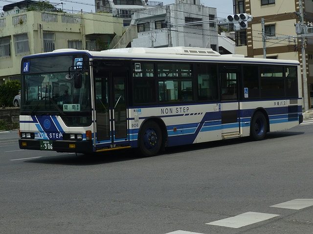 こちらも横浜市交通局から移籍した中扉4枚折戸仕様のMPワンステップ車。交通バリアフリー法に対応した自社発注の低床車は塗装を青色系のカタログカラーデザインとなっていますが、移籍車は従来の沖縄バス塗装デザインを継続採用しています。