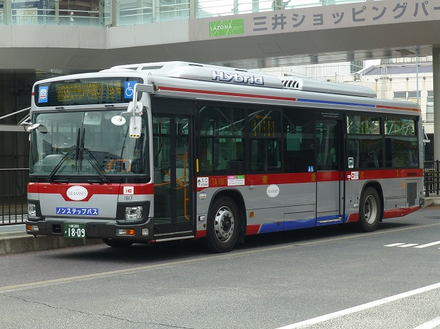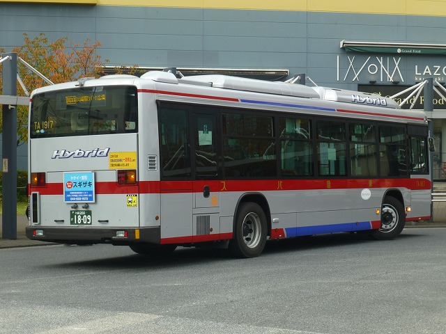 ハイブリッド車は1994年から導入しており、現在は日野ブルーリボンハイブリッドの導入が続いています。画像の日野ブルーリボンハイブリッドは高津営業所配置の東急トランセ委託車両。東急トランセ所属車両だけでなく委託車両も正面・側面にトランセのロゴステッカーを貼っています。