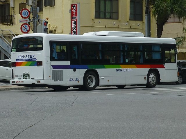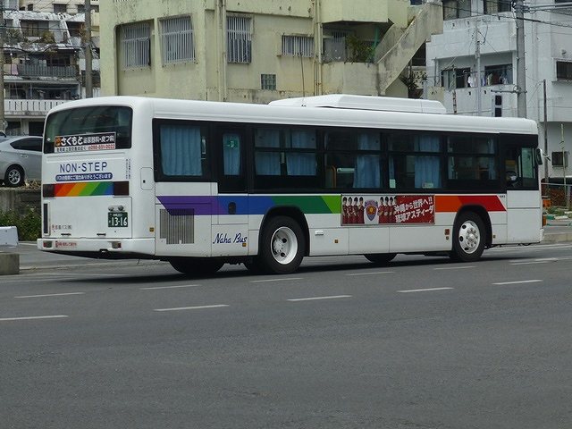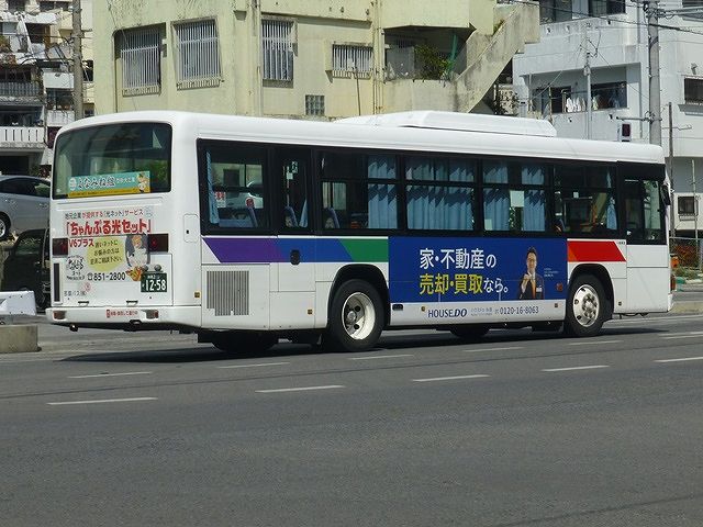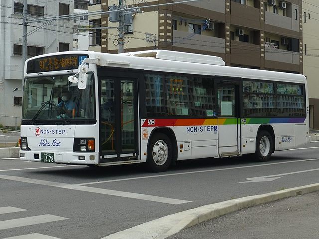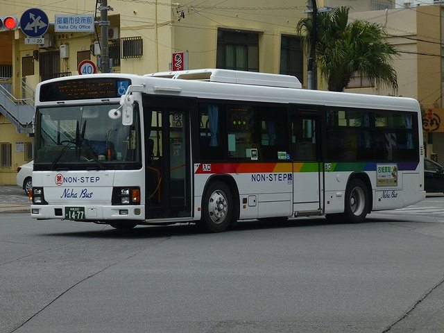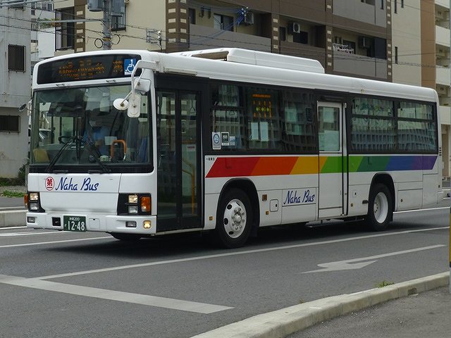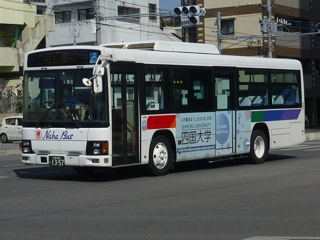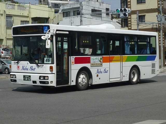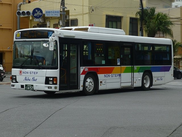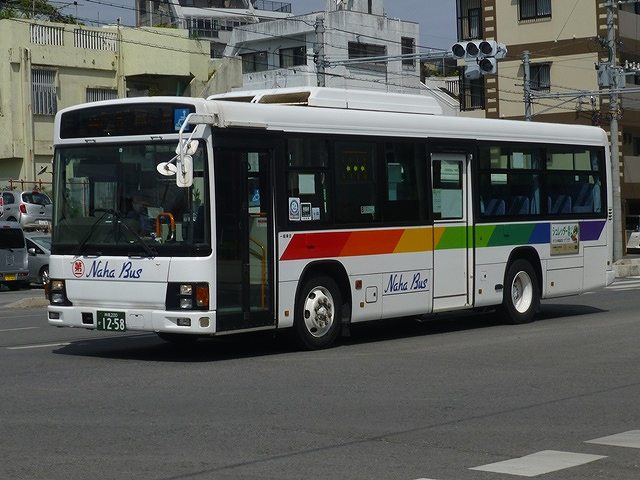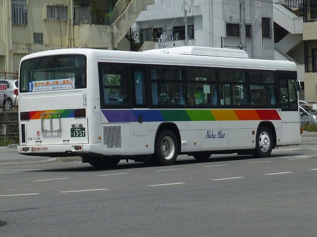 まずは京浜急行バスから移籍したKL規制車の日野HR10.5mサイズ。日野HR10.5mサイズは那覇バスに複数台在籍していますが、市外線配置はこの車両だけ。実はレア車ということになりますが、同色の塗装が琉球バス交通に複数在籍しているのでレアという実感はそれほどありません。