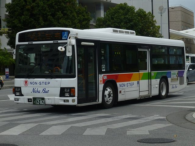 京浜急行バスから移籍車をまとめて購入しているためか、たまに少数派だった車種もやってきます。大型幅9mサイズのRPワンステップ車は那覇バスに2台だけ在籍しています。日野製エンジンを搭載したPK規制車で、テールライトはシビリアンタイプ、デンソー製クーラーを装備しています。