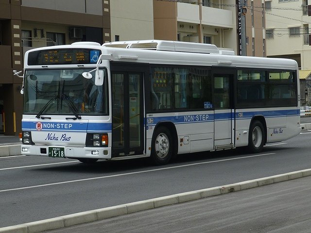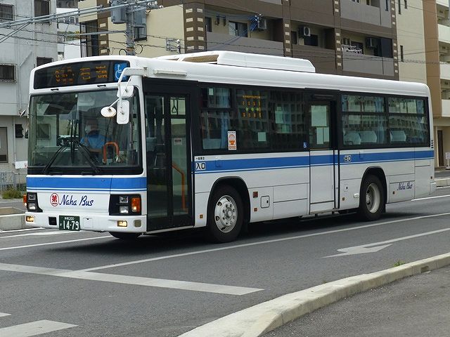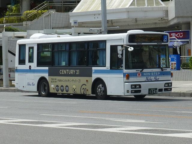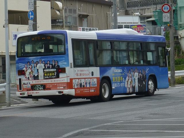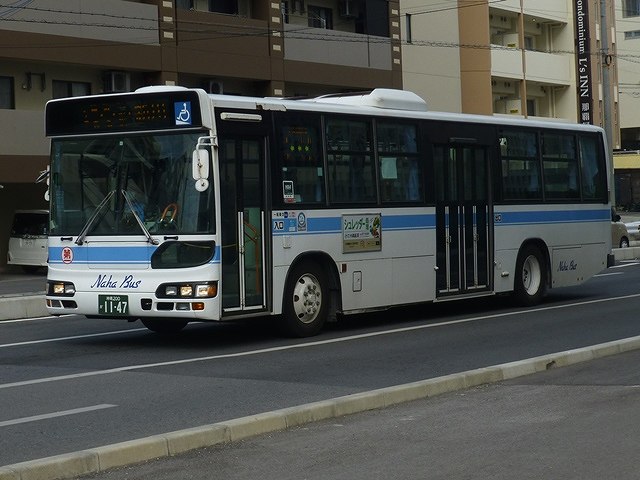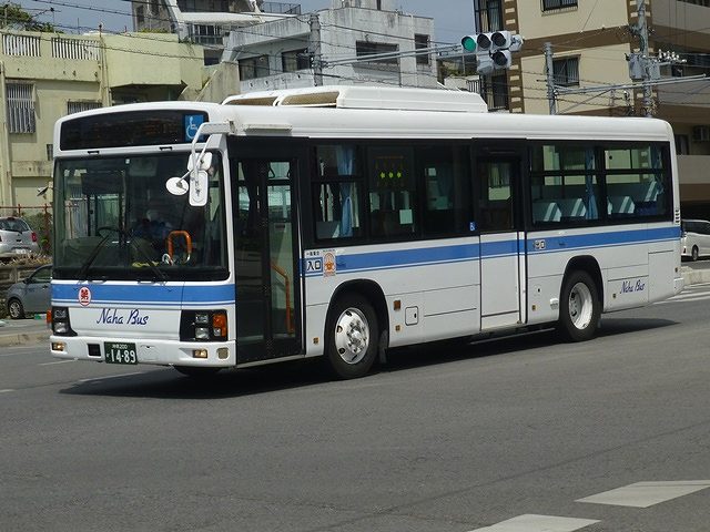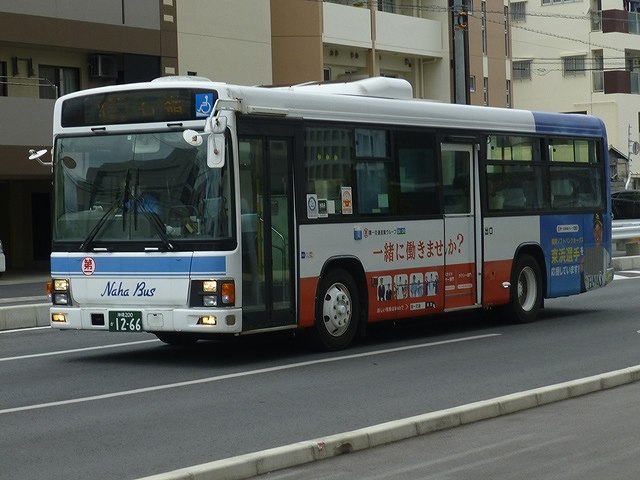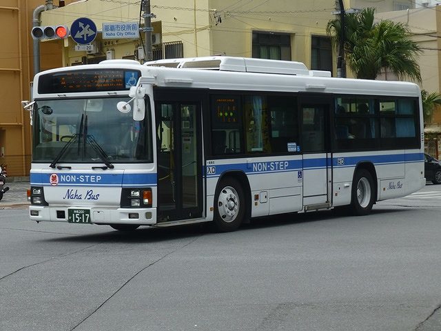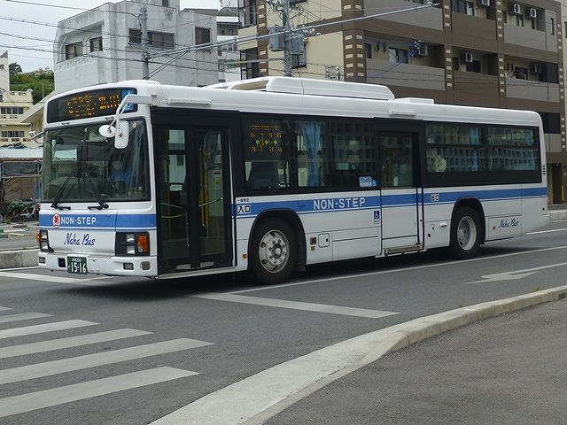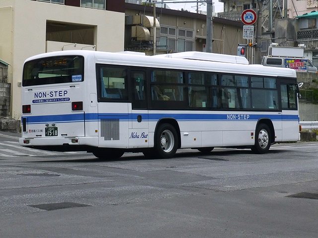 まずは東急バスから移籍した中扉4枚折戸仕様の日野ブルーリボンシティワンステップ車。第一交通産業傘下の那覇バス・琉球バス交通は京浜急行バスと東急バスから移籍車を相当な台数導入していますが、日野ブルーリボンシティの移籍車はごくわずか。在籍しているブルーリボンシティは画像の那覇バス市内線運用車両1台のみとなっています。長尺車なので市内線での使い勝手が気になるところ。