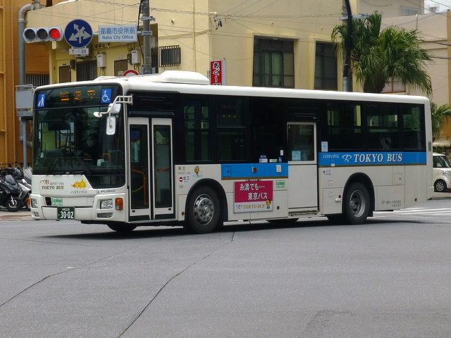 まずは那覇中心部の国際通り入口と糸満市役所・琉球ホテル&リゾート名城ビーチを結ぶ「ウミカジライナー」・「ハーレーエクスプレス」を運行する東京バス沖縄営業所の車両から、三菱ふそうMPノンステップ車。