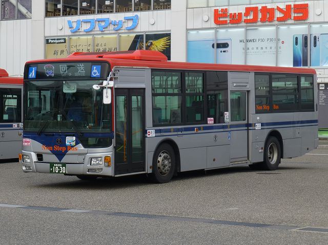 画像は14年から導入が続いている現行マスクの三菱ふそうMPノンステップ車。14~16年にかけ新潟市内路線向けに大量導入したこともあり、いまや60台以上が在籍する主力車種となっています。