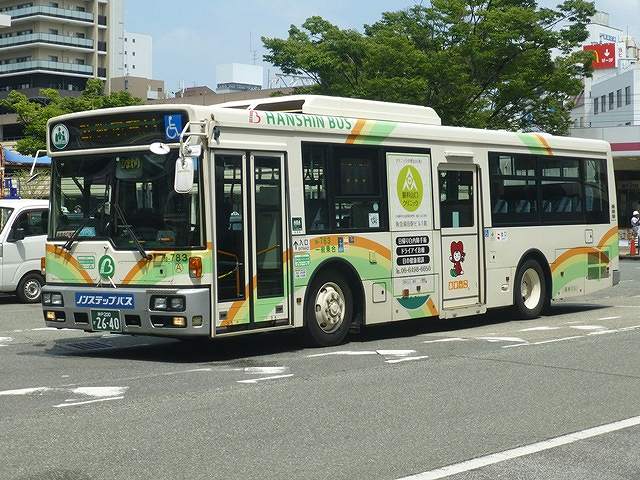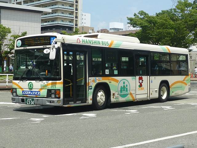 尼崎市交通局が保有していた車両は阪神バスに引き継がれ、社名表記を変更・追加した程度で運行しています。社番の変更無し、「虹バス」塗装もそのまま、側面中央には当時の尼崎市交通局キャラクター「あまっこ」も貼られています。社番を変更しなかったため、既存の阪神バスと異なる付番法則の車両が混在する状況となっています。