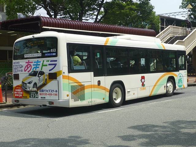 後面ラッピング広告の「あまドラ」こと尼崎ドライブスクールは2021年7月から阪神バスと送迎バス共同運行を開始しています。教習生は在校期間中、阪神バスの一般路線に全線無料で利用できるとのこと。なんかすごい特典です。
