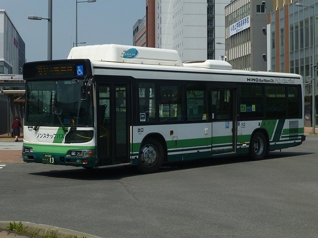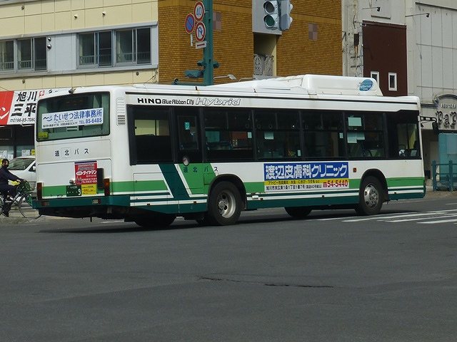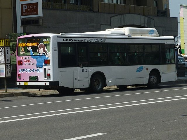 先代の日野ブルーリボンシティハイブリッドは05年車から10年車まで計9台在籍しています。ただし05年車は川崎鶴見臨港バスからの移籍車で、06年導入車はメーカーサンプルだった車両といわれています。メーカーサンプル車は白一色にハイブリッドのロゴがいくつもあるカタログカラーでしたが、道北バスはなぜかこのデザインをブルーリボンシティハイブリッドの標準カラーに採用しました。時は流れて、一部の車両はボディ更新にあわせて道北バスノンステップバスカラーに塗り替えられています。