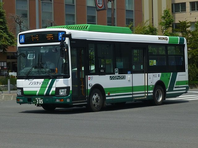 2台在籍する現行モデルの日野ブルーリボンハイブリッドは、当初から道北バスのノンステップバス塗装デザインで登場しました。屋根はバッテリー部分を緑色に塗り分けています。