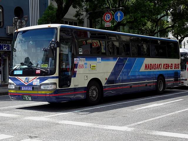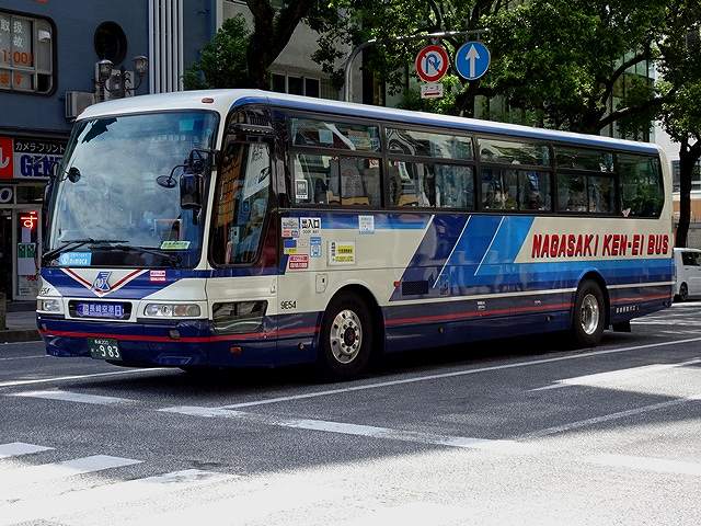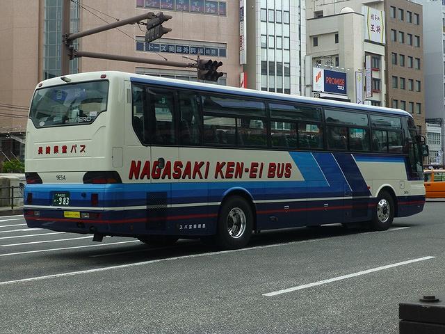 スイング扉仕様のエアロバス。こちらも移籍車で、貸切からの路線転用車です。後面の行先表示を窓下辺に取り付けているのが特徴。側面最前方の窓が固定ガラスとなっているのが、長崎県交通局生え抜き車両と異なる仕様です。