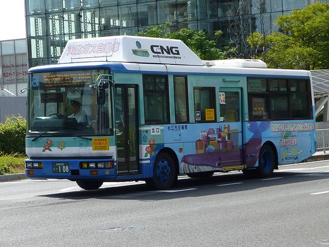 「2000年3月には国産初の中型CNGノンステップバスが発売 」開始となりました。画像の車両は松江市交通局が2001年に導入した車両。中国地方初導入となったCNG中型ノンステップ車で、ラッピングのスポンサーは「松江市ガス局」という分かりやすい1台でした。