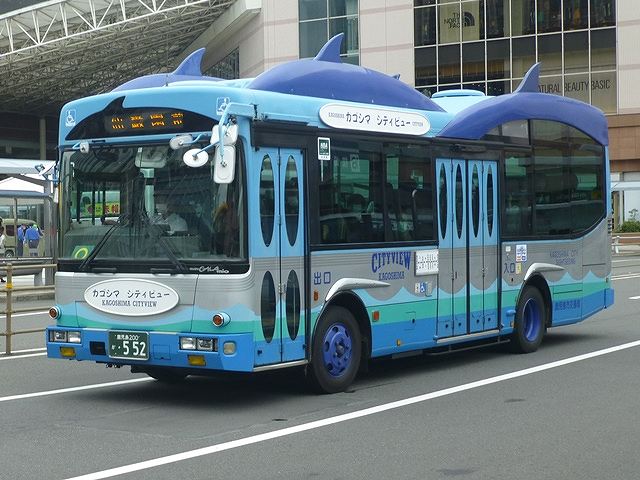 最後に鹿児島市中心部の観光スポットを循環する「カゴシマシティビュー」専用車から、海とイルカをイメージした外観のいすゞLRベースの改造車。2006年3月から運行を開始した「ウォーターフロントコース」専用車として登場しましたが、コース統合により現在は、市電風ボディの車両と共通運用となっています。ベース車両は「エルガミオ」ですが、フロントガラス下に「ガーラミオ」のステッカーを貼ってるのが特徴です。