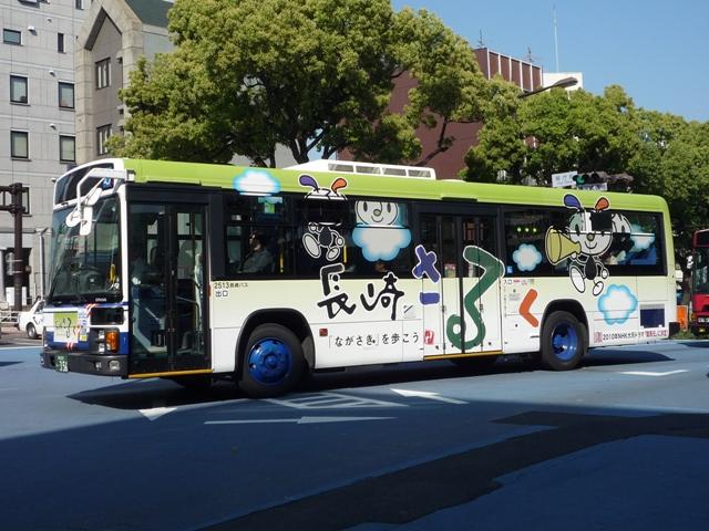 長崎さるく博ラッピング車。窓にまではみ出で貼られたキャラクターは、窓が開けられて