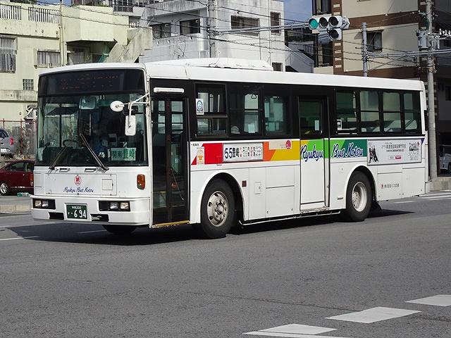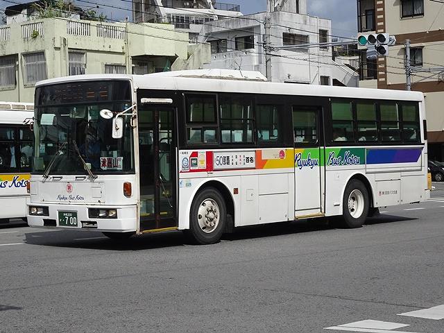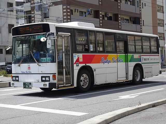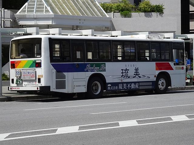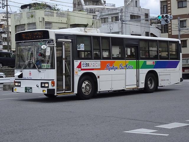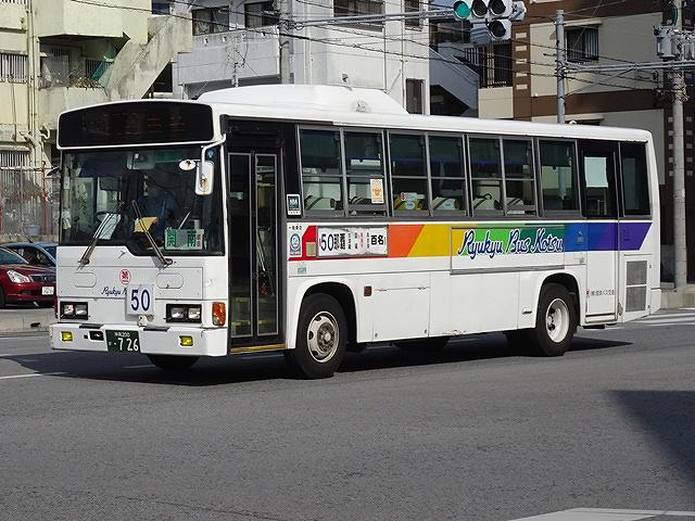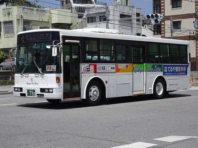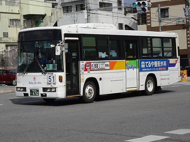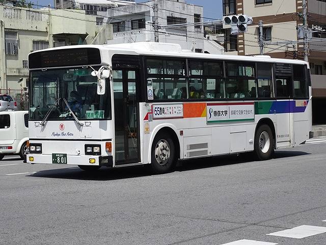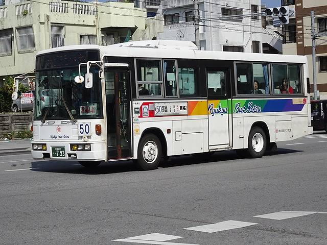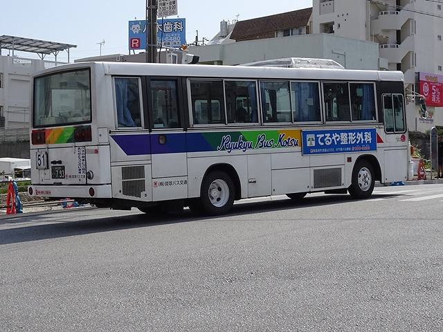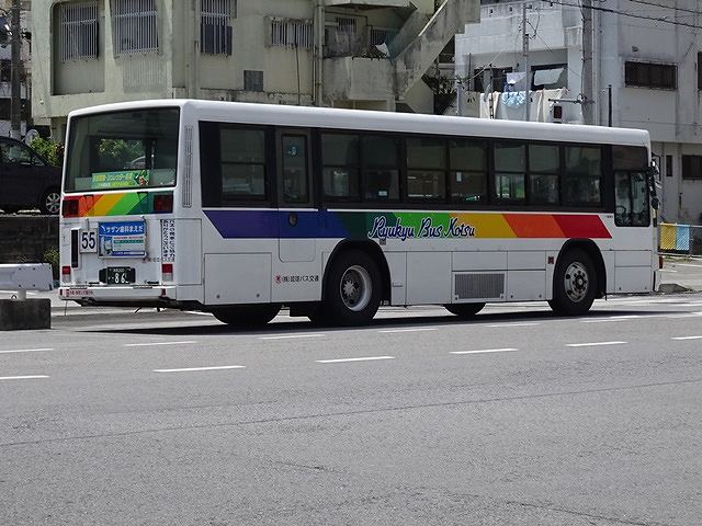 初期にまとめ買いした京浜急行バス移籍車は代替で姿を消し、現在古参格でまとまった台数在籍しているのが東急バスから移籍したツーステップ車です。まずは日野HTツーステップ車。移籍当初は東急バス時代と変わらずフロントバンパーにフォグライトを装備していませんでしたが、後付けしたのかバンパーを交換した模様。行先表示は前面・側面・後面にLED器を取り付けているので、系統番号板や行先表示板はありません。ただ、正面の第一マーク下の「Ryukyu Bus Kotsu」ロゴは系統番号板との干渉を避けるため運転席側に寄った配置となっています。