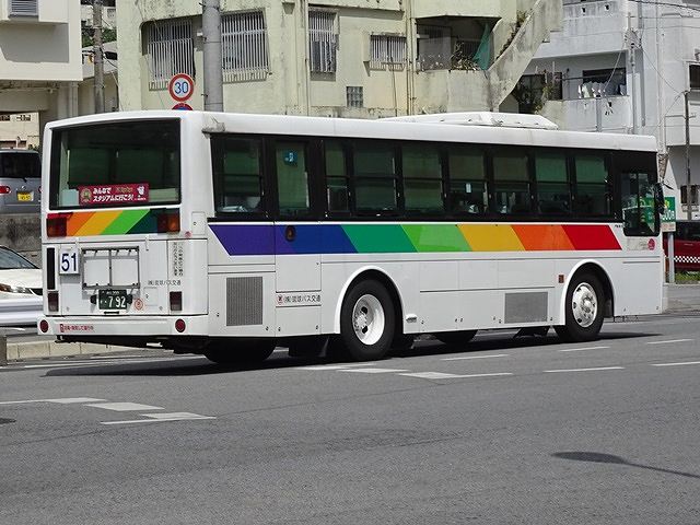 前後扉仕様で高出力エンジンを搭載した日野HUツーステップ車は神戸市交通局からの移籍車。フロントバンパー部にコーナリングライトを装備しているのが特長です。琉球バス交通に神戸市交通局からの移籍車は複数台在籍していましたが、現在残っているのはこの1台のみ、いつ姿を消してもおかしくありません。