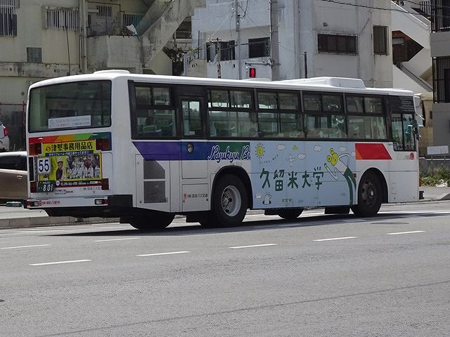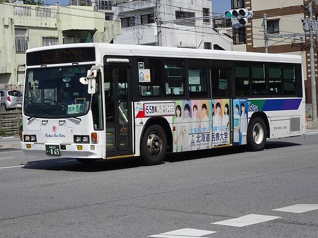 純正キュービックボディのいすゞLVは東急バスからの移籍車。画像の車両は運転席側面に北海道医療大学のラッピング広告、沖縄で北海道の学校の広告!?学生の獲得も大変です。